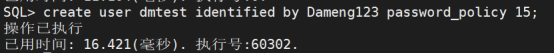 SQL> create user dmtest identified by Dameng123 password_policy 15;