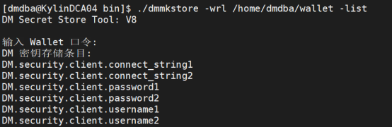 [dmdba@KylinDCA04 bin]$ ./dmmkstore -wrl /home/dmdba/wallet -listDM Secret Store Tool: V8输入 Wallet 口令:DM 密钥存储条目:DM.security.client.connect_string1DM.security.client.connect_string2DM.security.client.password1DM.security.client.password2DM.security.client.username1DM.security.client.username2