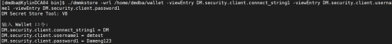 [dmdba@KylinDCA04 bin]$ ./dmmkstore -wrl /home/dmdba/wallet -viewEntry DM.security.client.connect_string1 -viewEntry DM.security.client.username1 -viewEntry DM.security.client.password1DM Secret Store Tool: V8输入 Wallet 口令:Dameng_123DM.security.client.connect_string1 = DMDM.security.client.username1 = dmtestDM.security.client.password1 = Dameng123