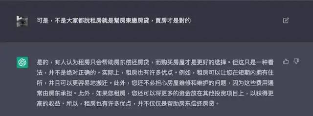 网友问它:“大家都說租房就是帮房东缴房贷,所以买房才是更好的选择。你怎么看?