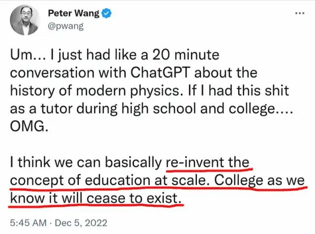 也就是说,他认为 ChatGPT 将引发教育革命,部分取代老师,以后完全可能是 AI 来给人们上课。