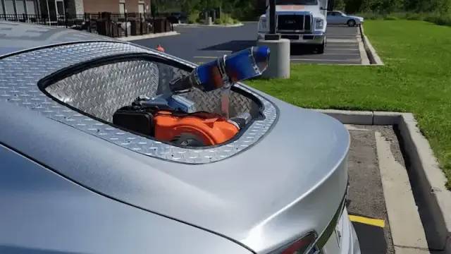 他买了一个汽油发电机,然后自己改装特斯拉,车上自备汽油,然后把发电机接上充电口。不用车时,发电机就会启动,给特斯拉充电。
