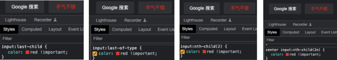 | 逻辑组合伪类 (:not,:is,:where,:has) | 如其名,根据关系排查元素 | 通过逻辑判断条件筛选到元素 |