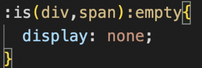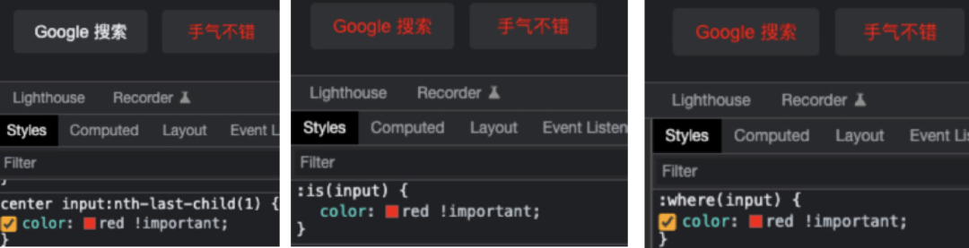 3、:is,:where 任意匹配伪类,之所以把这2个放一起,是因为最终的达到的效果是差不多的,最大的区别可能就是优先级了,is的权重计算值以参数中权重最高的为其权重,而where无论参数是什么,最终的权重计算值始终为0(权重计算值会在下面介绍)。任意匹配伪类在我看来不是一个必选项,他并没有实现一些额外的功能,最大的最用就是精简选择器了,如下如图: