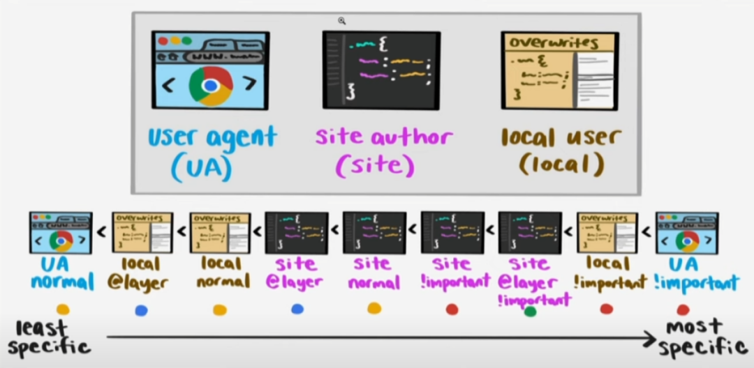 local:用户样式,浏览器允许用户通过配置给其加载一些样式表,使用频率非常低。可以理解为定制化浏览器默认样式