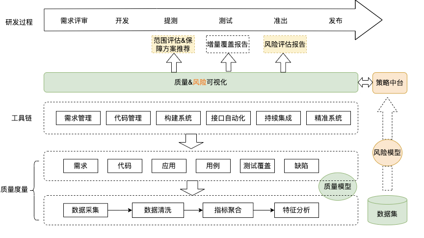 要想把握风险,首先要识别风险,基于质量度量,从需求项目出发,收集研发过程中各个环节研发质量和风险相关的数据,通过质量模型定义动态评估量化质量情况,识别研发过程中的风险,建立风险模型,通过策略中台为需求项目测试提供质量保障方案决策支持。