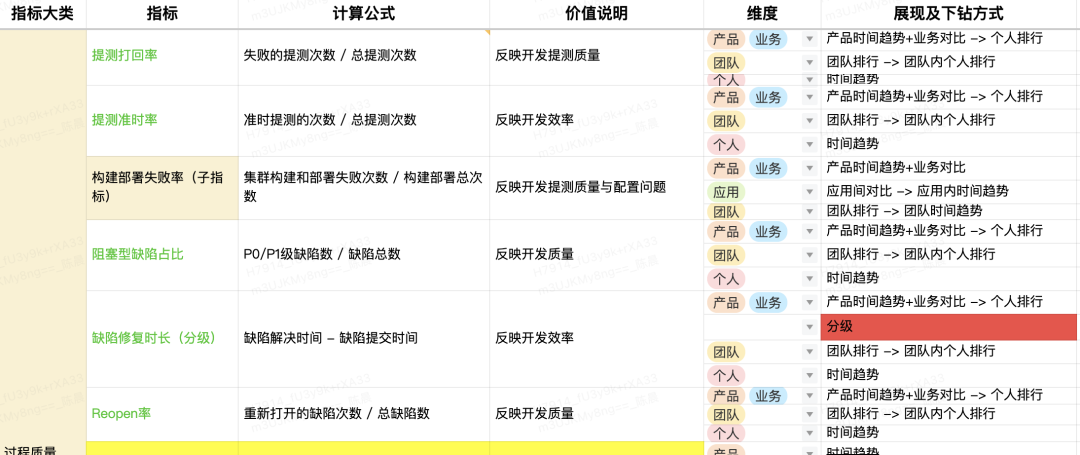 因为我们前期已经有部分质量数据指标沉淀,所以这一阶段只是对已有的质量模型做优化,我们业务当前重点在交付质量的提升以保障线上业务的高可用和稳定性,优化重点在过程质量相关指标,增加部分核心过程指标,旨在提升交付质量(对应的结果指标)。
