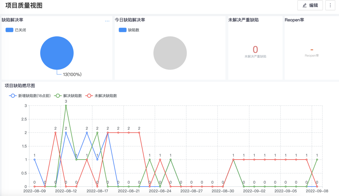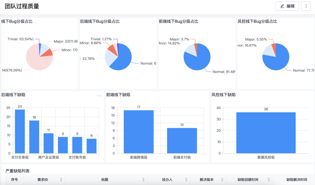 提供团队,个人,需求项目等各个维度过程质量数据图表供团队成员随时查看;月度/季度质量报告增加过程质量数据指标,为团队个人过程质量情况评估提供抓手;