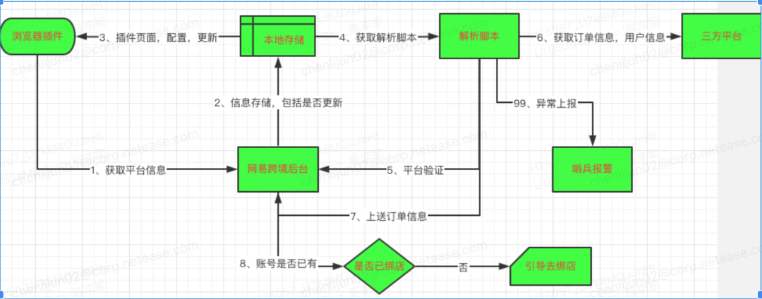 通过注入的脚本获取对应电商平台的用户id并到跨境服务平台上查询,如果无则直接提示失败,并展示失败原因,如果有则展示商户信息,让用户确认,确认之后则开始正式的采集, 采集的时候需要注意请求的间隔也需要尽量模拟用户的真实操作,将采集到的订单信息上传到跨境服务收款平台,从用户上次采集的最后一个订单开始,一直采集到最新的订单,如果中途有一个错误,则错误之后的所有订单都不上传。