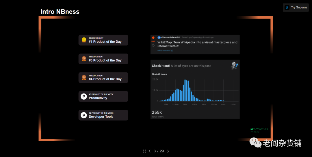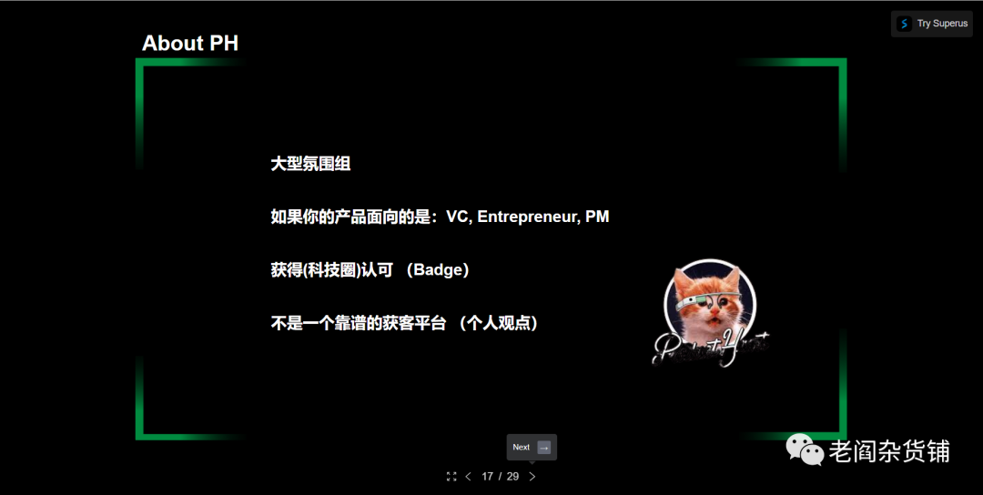 上午刚刚跟Victor一起交流过,Victor讲了他做PH的一些经验,也回答了我关于PH是否是个合适的获客渠道的问题(答案跟我自己的认知一致)。Victor的分享是用Superus的内容直接做的,这里贴一张现场照片,然后把关键内容我则用他们线上内容直接截屏出来。