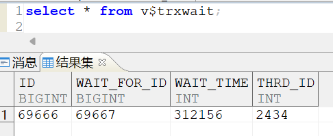 一般运维人员都是从这步开始的,查询v$trxwait视图,发现事务69666被事务69667阻塞了,已经阻塞了312秒。