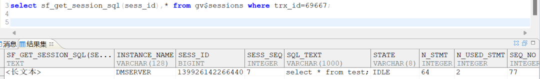 select sf_get_session_sql(sess_id),* from v$sessions where trx_id=69667;