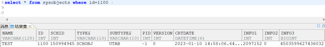 select * from sysobjects where id=1100 ;