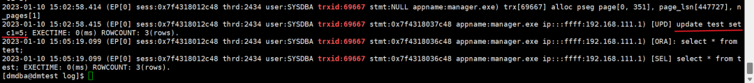 cat dmsql_DMSERVER_20230110_14*.log | grep “trxid:69667” > tmp/sql.log