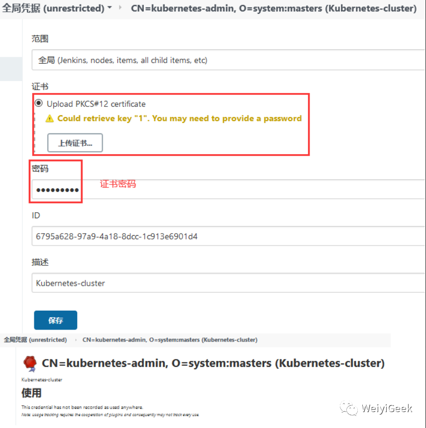 # 在Kubenates的上创建devops命名空间,用于Jenkins使用 (若已创建可跳过)kubectl create namespace devops# 在Kubernetes上为Jenkins构建创建有Cluster Admin权限的Service Account jenkins(若已创建可跳过)kubectl create clusterrolebinding jenkins --clusterrole cluster-admin --serviceaccount=devops:jenkins# 在最新 ~/.kube/config 配置文件, 运行以下命令分别生成生成 ca.crt, client.crt, client.keycat ~/.kube/config | grep "certificate-authority-data" | sed s/[[:space:]]//g | cut -d ':' -f 2 | base64 -d > ca.crtcat ~/.kube/config | grep "client-certificate-data" | sed s/[[:space:]]//g | cut -d ':' -f 2 | base64 -d > client.crtcat ~/.kube/config | grep "client-key-data" | sed s/[[:space:]]//g | cut -d ':' -f 2 | base64 -d > client.key# 根据前面步骤生成的 ca.crt, client.crt 和 client.key 来生成 PKCS12 格式的 cert.pfxopenssl pkcs12 -export -out cert.pfx -inkey client.key -in client.crt -certfile ca.crt# Enter Export Password: weiyigeek# Verifying - Enter Export Password: weiyigeek