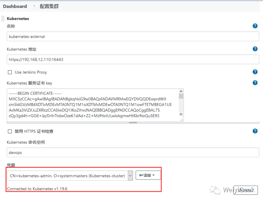 解决办法: 可参照此篇文章进行【 https://blog.weiyigeek.top/2020/12-30-531.html#独立Jenkins-Master节点接入外部K8s集群 】进行更新Jenkins上连接K8S集群的APIServer证书,或者按照如下方法进行。