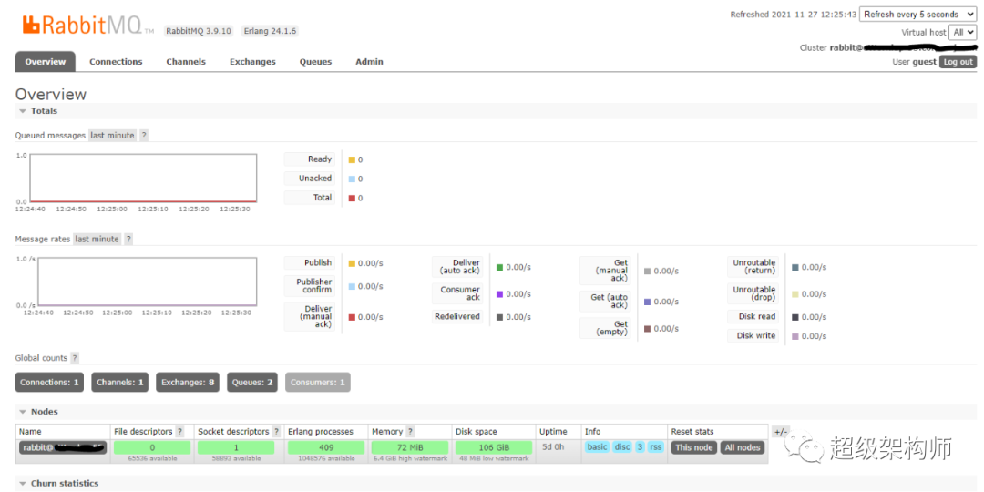 按照此链接在 Windows 上安装 RabbitMQ。安装后 RabbitMQ 服务将在 http://localhost:15672/ 上启动并运行。在用户名和密码中输入“guest”登录,您将能够看到所有静态信息。