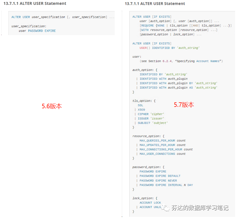 语法支持 5.6、5.7、8.0 三个版本的数据库修改密码,而 alter user