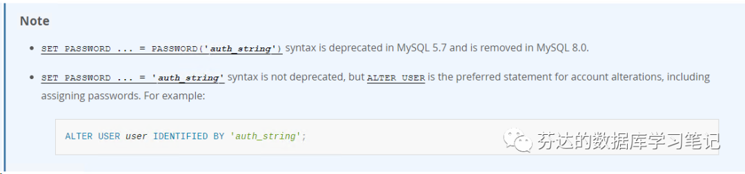 而 MySQL 在 5.6 及之前版本居然是不支持这种 alter user 语法修改密码的。他使用 set password 语法修改密码。