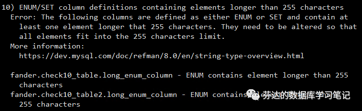 MySQL8.0 不支持 ENUM/SET 列定义包含长度超过 255 个字符的元素。而 MySQL5.7 则在 innodb 引擎里完全无限制,我用了两个例子,一个是 260 个字符刚刚超过,一个是离谱的 26000 个字符,两个例子都能创建表成功。使用枚举类型的情况不多见,同时枚举类型的某元素名称超过 255 个字符的情况更不多见,如果检查出这种情况请整改。
