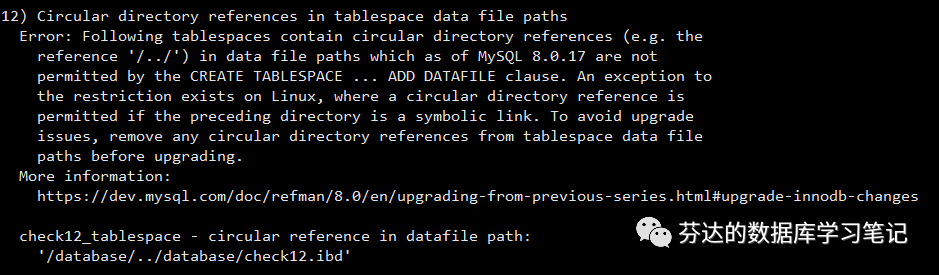 以下表空间在数据文件路径中包含循环目录引用(例如引用 '/../'),在 MySQL8.0.17 及以后版本的 CREATE TABLESPACE ... ADD DATAFILE 子句中不允许这种情况。对此限制在 Linux 上存在一个例外,如果前面的目录是符号链接,则允许循环目录引用。为避免升级过程中的问题,在升级前请从表空间数据文件路径中移除任何循环目录引用。