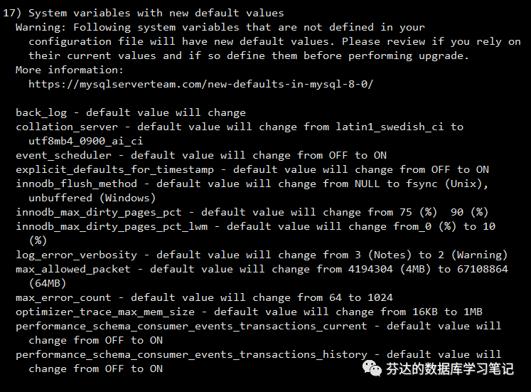 以下未在您的配置文件中定义的系统变量将具有新的默认值。如果您依赖它们当前的值,请在执行升级之前对它们进行审核并定义。
