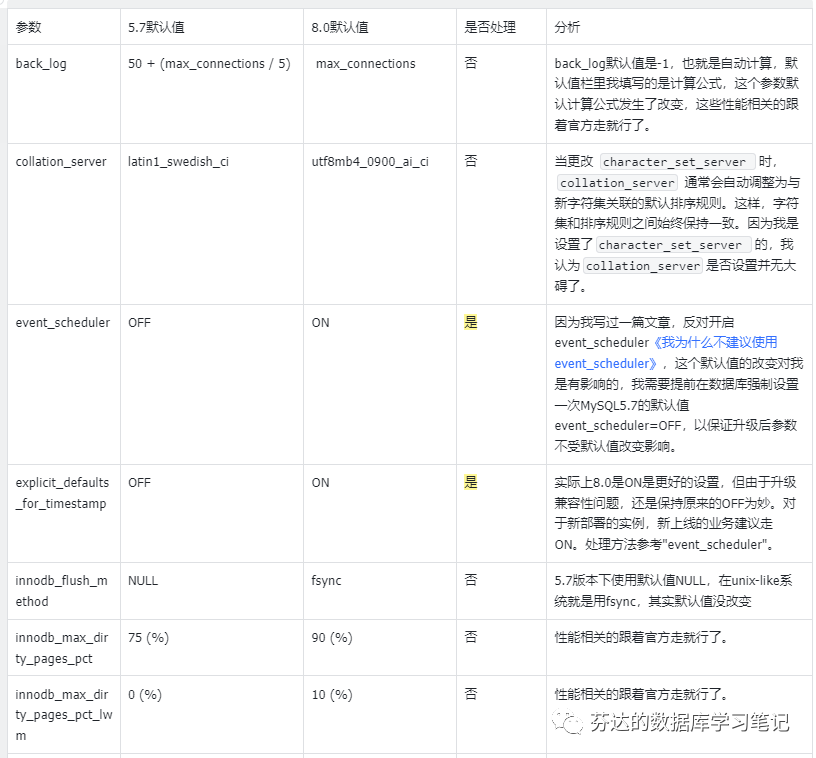 实际上,我习惯于在 my.cnf 强制设置一些默认值,代表虽然我是用了默认值,但他很重要,我担心其未来参数改变。所以我如果没有配置的参数,绝大多数可以定性为"我不在乎"的。我这次案例里的 my.cnf 有两个参数我需要整改,分别是 event_scheduler