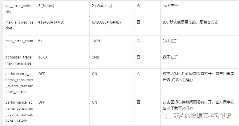 我用的正经的生产环境的配置文件做的检查,有警告的参数配置还真不少,大多数不需要管,少部分需要处理,以下表格是我的分析: