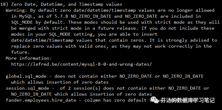 所以,数据库里有零值日期的情况,并不会影响数据库升级,但会影响升级后查询的逻辑,有可能之前能查到的数据升级后查不到了,所以给出 warnings 让您核实情况。脚本没有直接查询表里是否有零值的情况,而是通过检查变量检查表结构和检查参数设置的方法,我猜是因为工具不希望去扫描用户表(而且还是模糊搜索),以免造成生产影响。