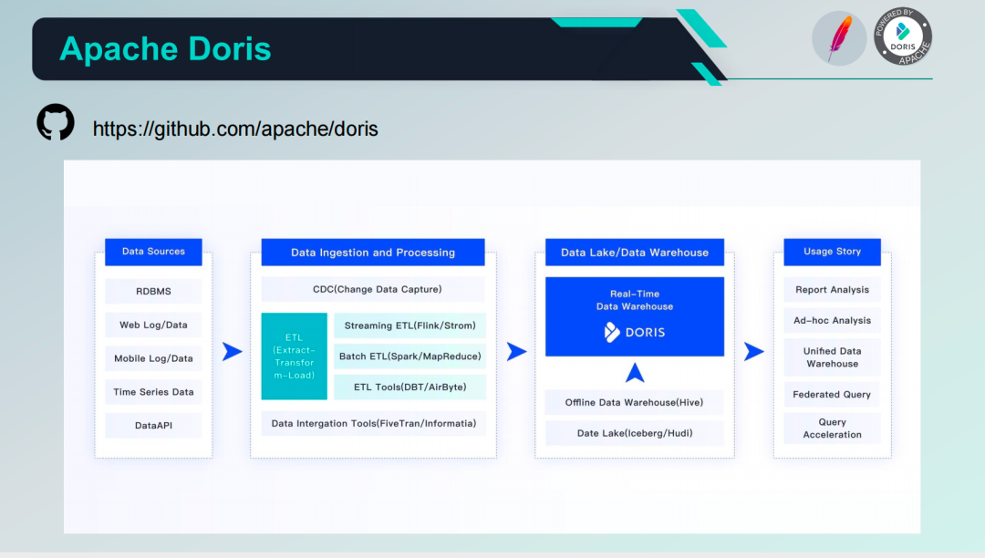 首先要运用到的是 Apache Doris。Apache Doris 是一个基于 MPP 架构的高性能、实时的分析型数据库,以极速易用的特点被人们所熟知,仅需亚秒级响应时间即可返回海量数据下的查询结果,不仅可以支持高并发的点查询场景,也能支持高吞吐的复杂分析场景。