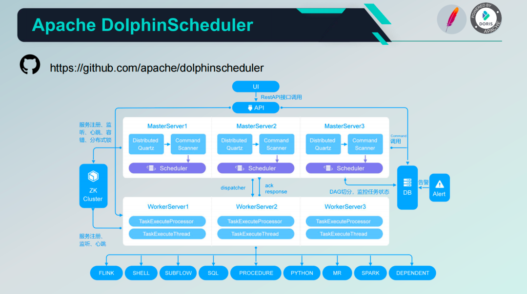 DolphinScheduler 是一个分布式去中心化,易扩展的可视化 DAG 工作流任务调度平台。致力于解决数据处理流程中错综复杂的依赖关系,使调度系统在数据处理流程中开箱即用。DolphinScheduler 采用了多 Master 和多 Worker 的实现形式,实现分布式、去中心化,支持 Flink、SQL等丰富的任务类型,且易于扩展。