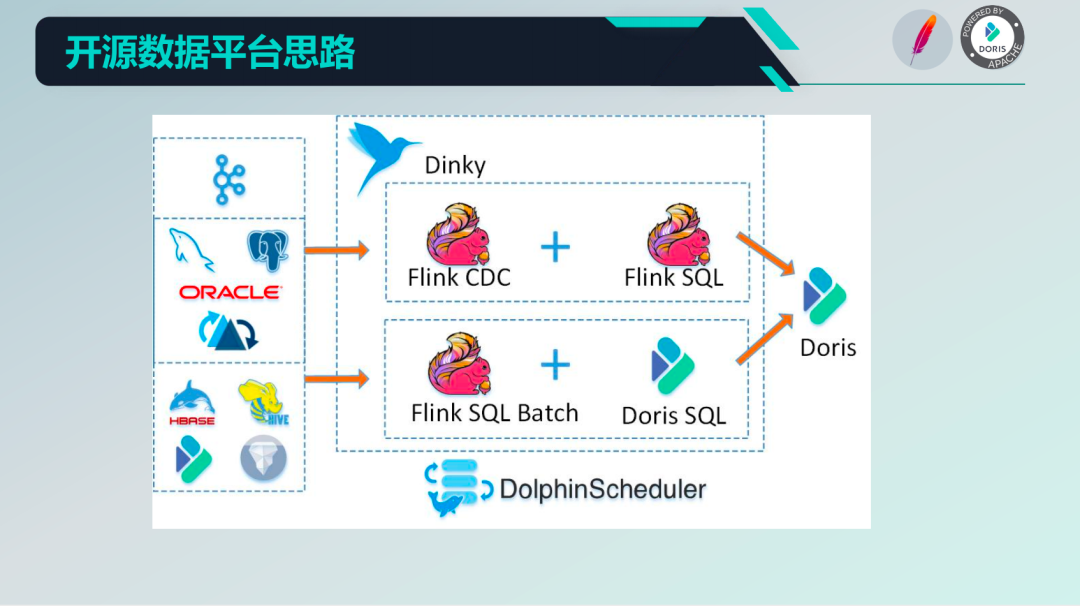 开源数据平台的设计思路是通过 Flink SQL Batch 以及 Doris SQL 的能力实现一个离线任务的开发;使用 DolphinScheduler 进行离线工作流编排和调度;通过 Flink CDC 和 Flink SQL 实现流处理能力,进行实时任务的开发;选择 Doris 作为实时数据仓库来写入数据并进行 OLAP 查询;通过 Dinky 来提供一个完整的任务开发运维的平台能力,满足常见的企业数据平台需求。