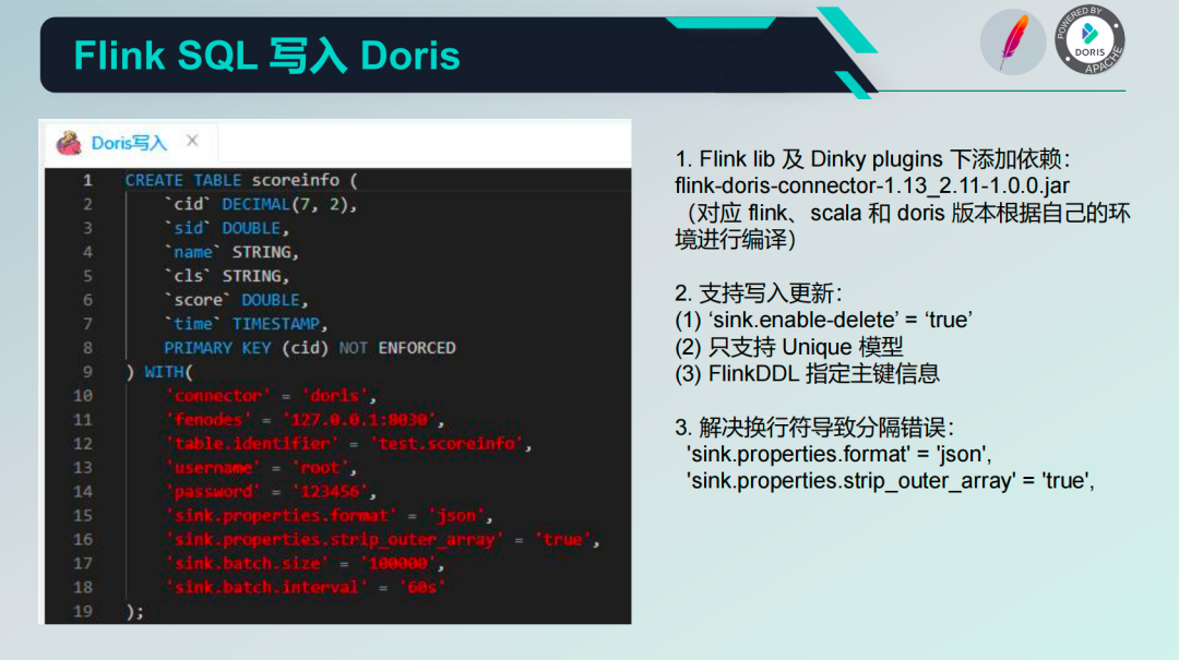 首先会运用到 Flink SQL 来写入Doris(本文介绍的是 Doris 版本为 0.15,1.1 版本改动较大请参考 Doris 官网文档),需要在 Flink Lib 以及 Dinky Plugins 下添加对应编译好的 Flink、Doris 的连接器,需要注意 Flink 、Scala、Doris对应版本,其次是如果要实现一个写入的更新,则需要开启一些配置。比如说: