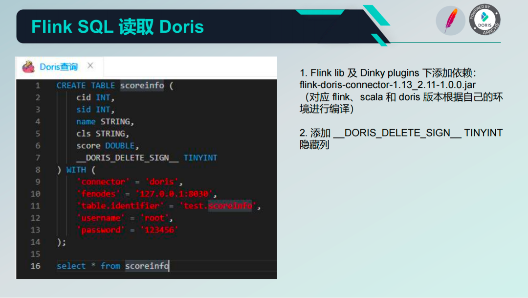 在 FlinkSQL 读取 Doris 过程中通常会遇到一个问题,在默认的 Doris 连接器实现中存在一个隐藏列,因此需要在 Flink DDL 中声明 Doris 的隐藏列,如下图所示。
