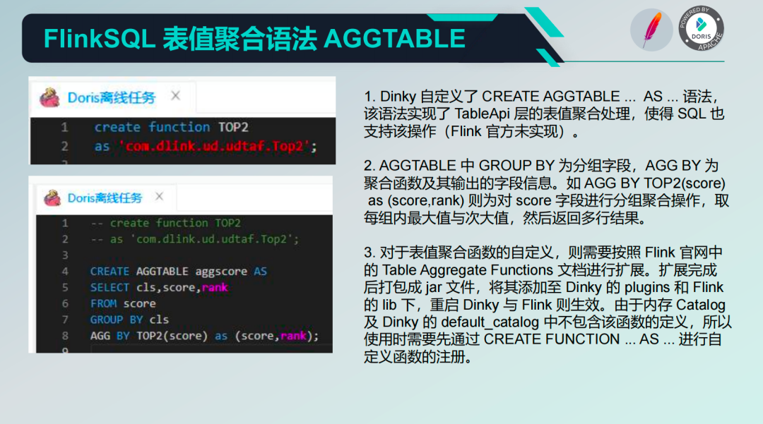 Dinky 自定义了 CREATE AGGTABLE ... AS ... 语法, 该语法实现了 TableApi 层的表值聚合处理,使得 SQL 也 支持该操作(Flink 官方未实现)。