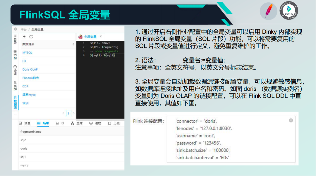 全局变量会自动加载数据源链接配置变量,可以规避敏感信息, 如数据库连接地址及用户名和密码。如图 Doris (数据源实例名) 变量则为 Doris OLAP 的链接配置,可以在 Flink DDL 中直接使用。