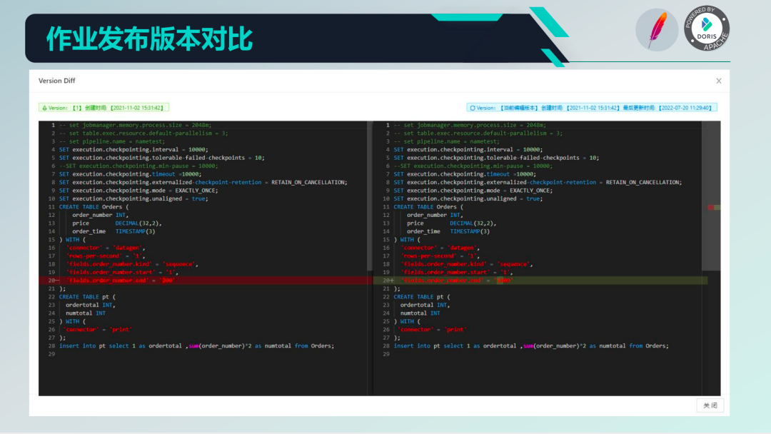 在管理大量作业的时候,通常会发生数据口径 FlinkSQL 的变化。Dinky 提供了作业版本管理的能力,在发布的时候会自动创建一个新的版本,后续可以对比每个版本中 SQL 的差异性,以及进行作业版本回滚操作。