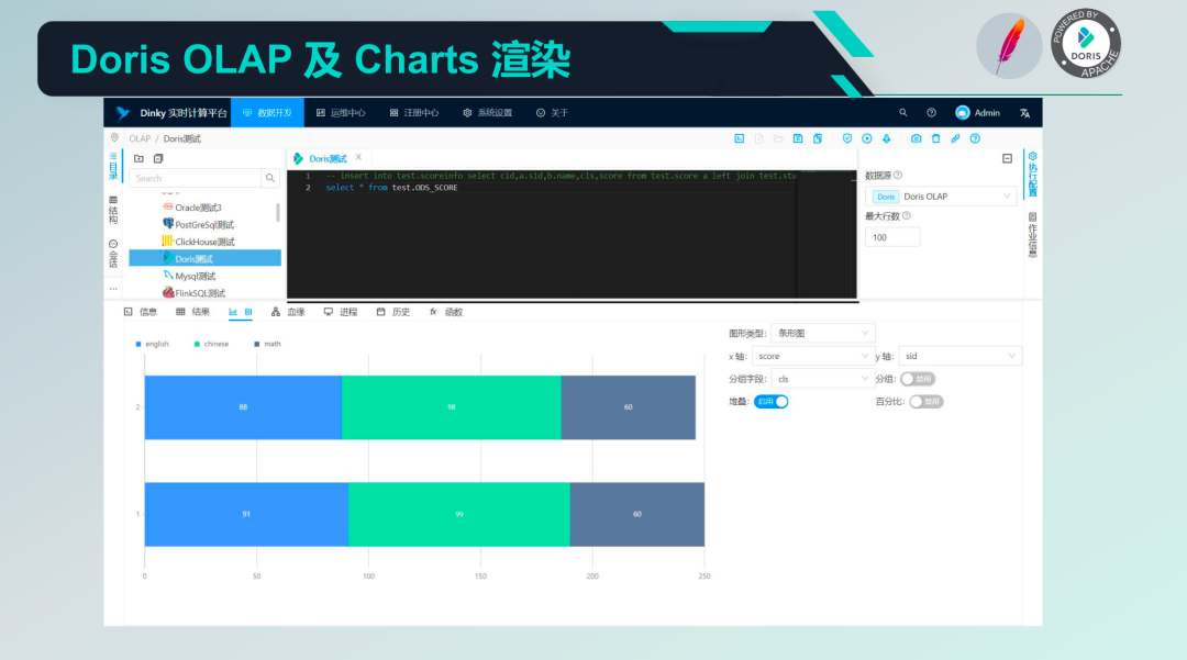 Dinky 支持 Doris SQL 语句查询和执行能力,此外还提供了简单的 BI 的功能,可以将 Doris 语句的查询结果进行 BI 渲染,如柱状图、折线图、饼图等。