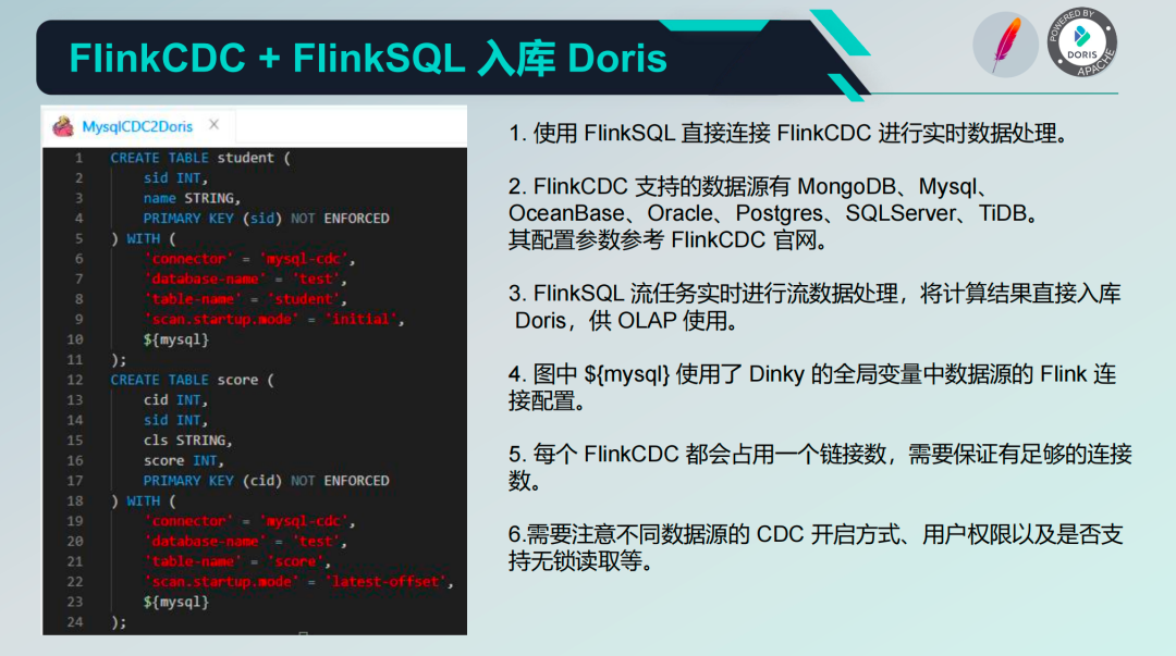 2.对于 ETL 需求可以直接使用 FlinkSQL+ Flink CDC 计算完成后入库 Doris。