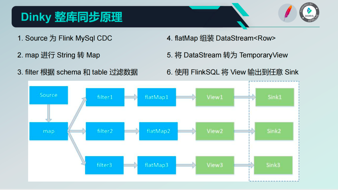 整库同步的原理是一个分流的操作:从 CDC 中读取出数据换成 Map,通过 Map 对 Schema 和 Table 进行过滤 ,过滤完之后组装成 Datastream<Row> ,最终再将 Datastream 转换成 TemporaryView,转换成视图之后,就可以使用 Flink SQL 进行操作。目前的操作是直接将它输出到任意的一个 Sink,当然此处可以进行改造,比如添加其他的定制处理,此外在上图的第四步,在组装 Datastream<Row> 后,也可以直接使用 Datastream 的 API 进行输出。当前 Dinky 对第三步 Filter 进行了优化,采用测输出流的方式来提升吞吐性能,提升约 20 倍。