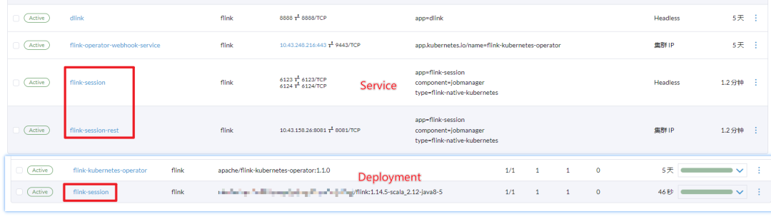 会自动创建 Flink Session Deployment(部署) 和 对应的 Service (服务发现 )