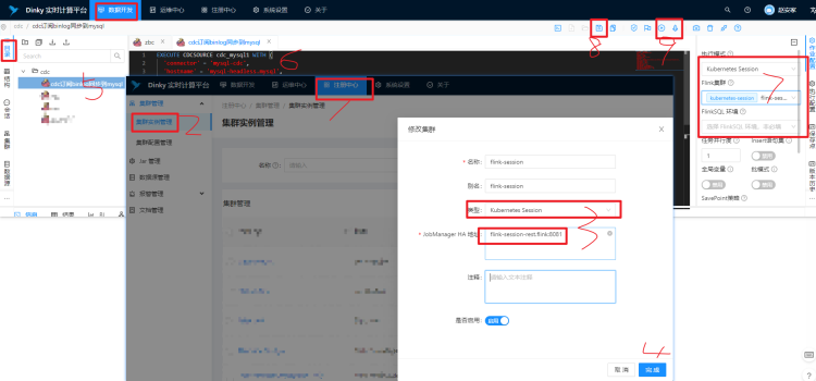 打开 Dlink Web 添加 K8S Session 集群,添加 作业,复制 CDCSource SQL 保存,并执行、或者异步提交。
