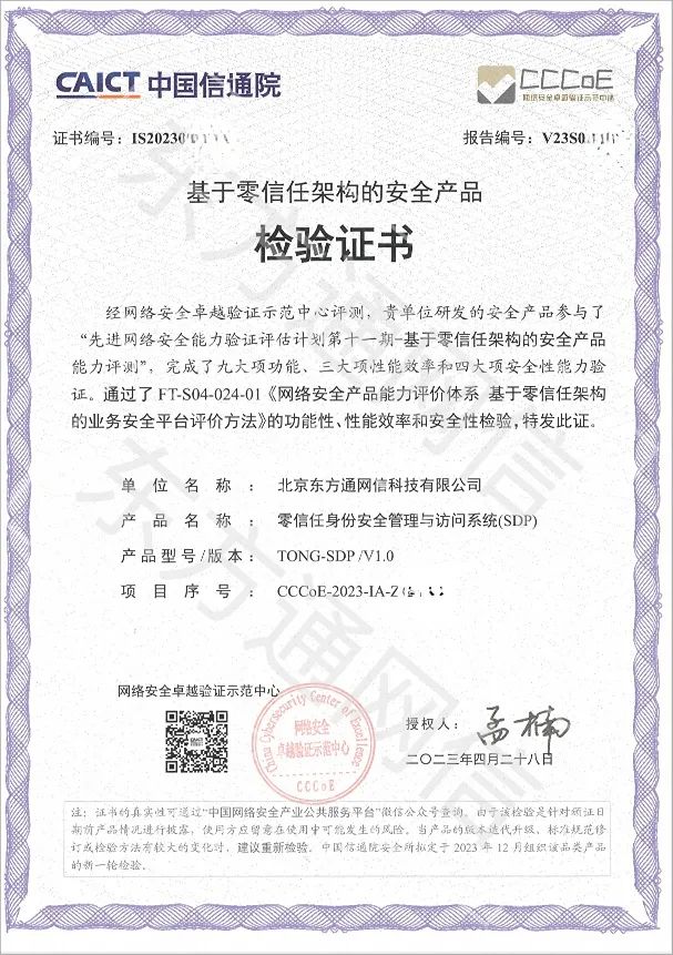 近日,在中国信通院组织的“先进网络安全能力验证评估计划(第十一期)-基于零信任架构的安全产品能力评测”活动中,东方通研发的“零信任安全身份管理与访问系统(SDP)”顺利通过了FT-S04-024-01《网络安全产品能力评价体系 给予零信任架构的业务安全平台评价方法》的功能性、性能效率和安全性检验,被授予基于零信任架构的安全产品检验证书。