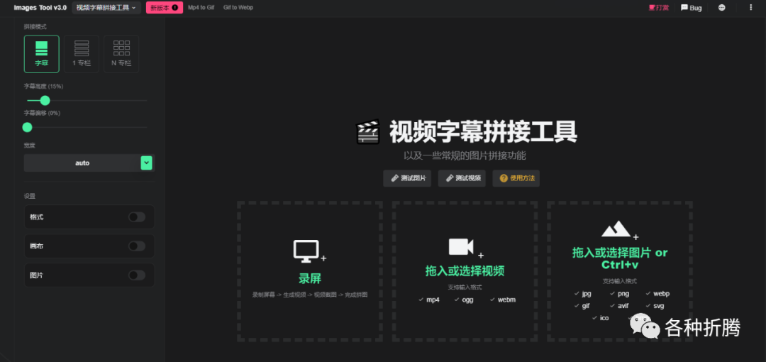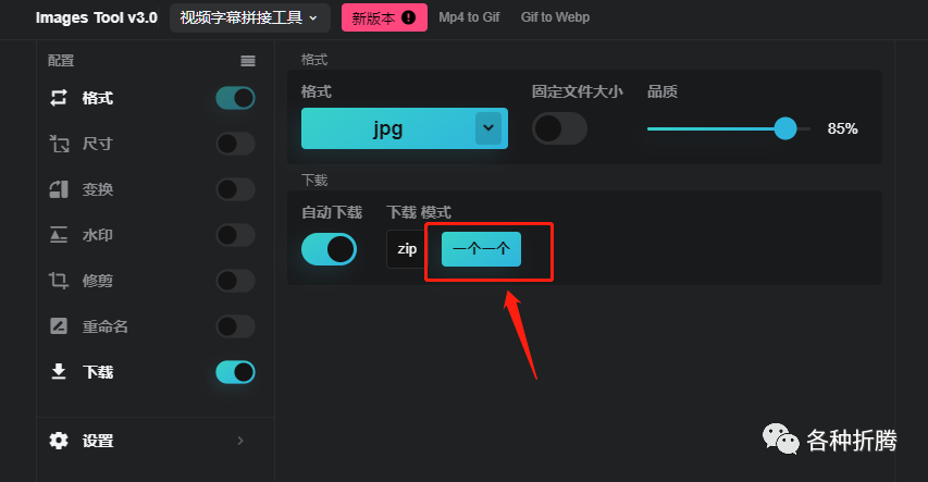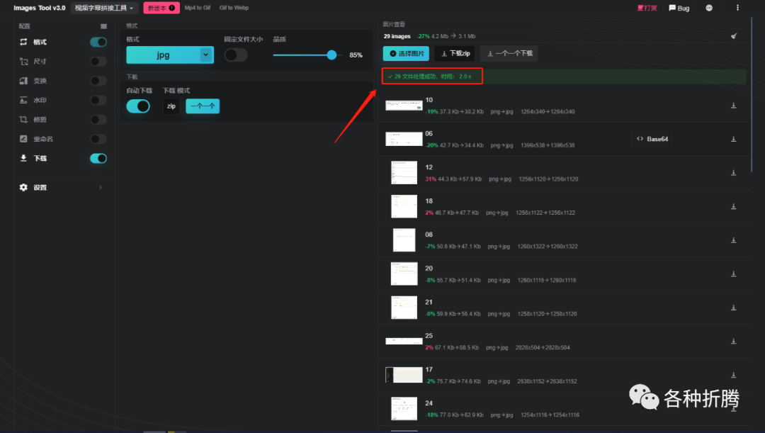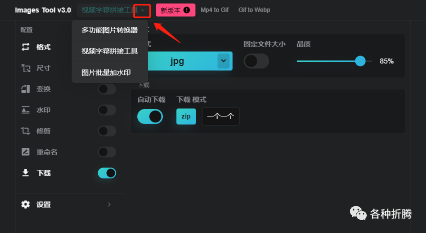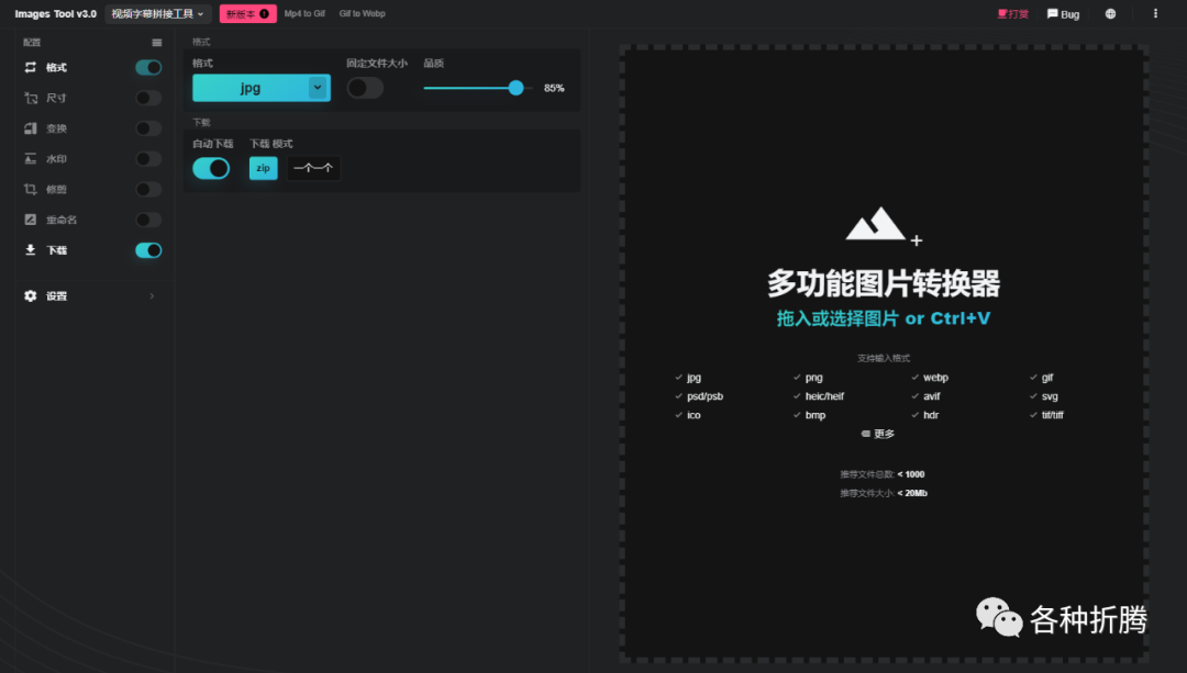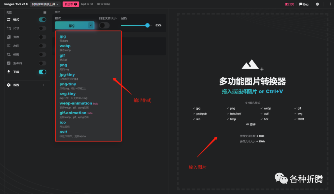 左侧红框可以选择不同的图片输出格式,右侧直接拖拽图片,支持一次多张图片