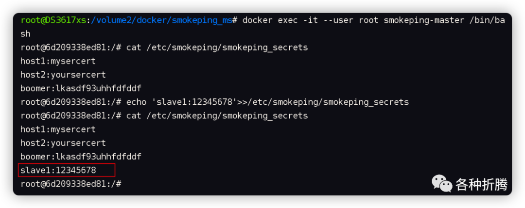 echo 'slave1:12345678'>>/etc/smokeping/smokeping_secrets