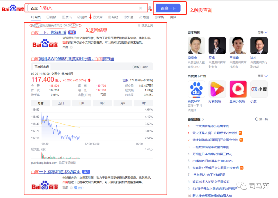 像百度搜索,就是一个大型的查询案例,输入关键字->点击搜索,就会触发程序逻辑去模糊搜索数据库里的数据,再展现到前端给用户阅览: