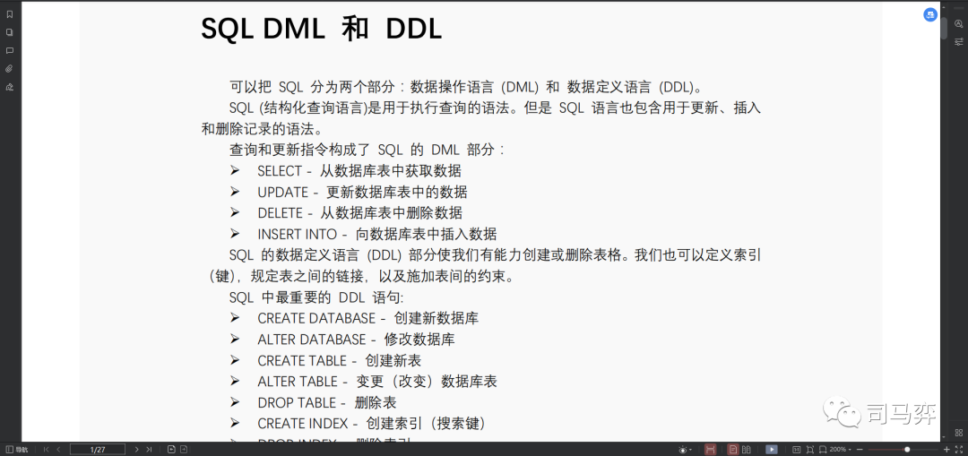 最后附上本人总结的27页SQL教程的pdf资料,需要的同学公众号回复:SQL文档,即可获取。