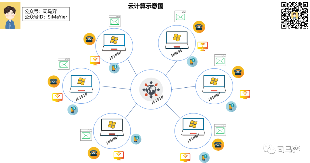 如图所示,中间的是云,其实就是网络、互联网的比喻,而其他被云连接的即为计算机服务器,程序应用又托管于云服务器上,而应用即面向用户;