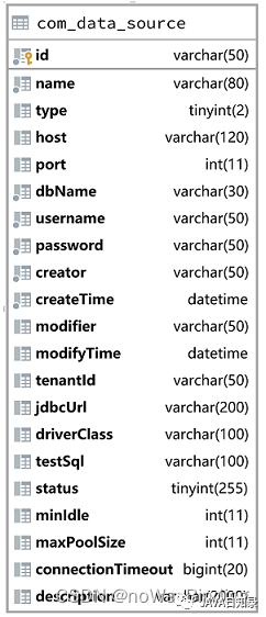 主库的数据源信息仍然配置在项目配置文件中,应用库数据源配置参数,则设计对应的数据表。表结构如下所示: