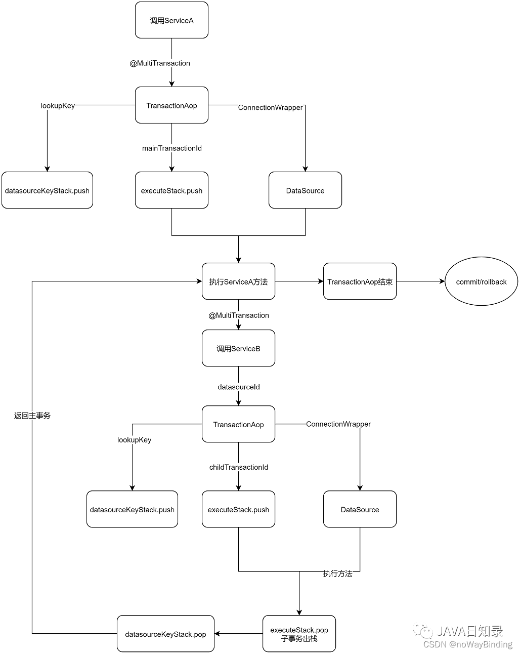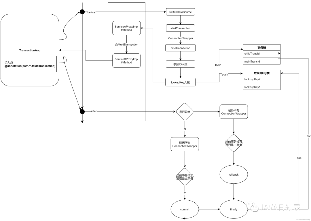 切面处理的核心逻辑是:维护一个嵌套事务栈,当业务方法执行结束,或者发生异常时,判断当前栈顶事务ID是否为主事务ID。如果是的话这时候已经到了最外层事务,这时才执行提交和回滚。详细流程如下图所示: